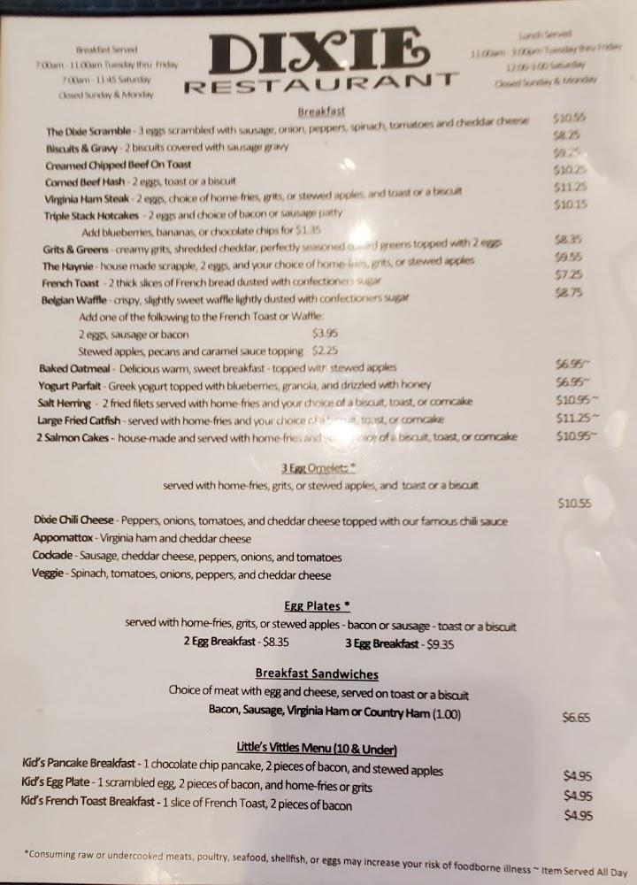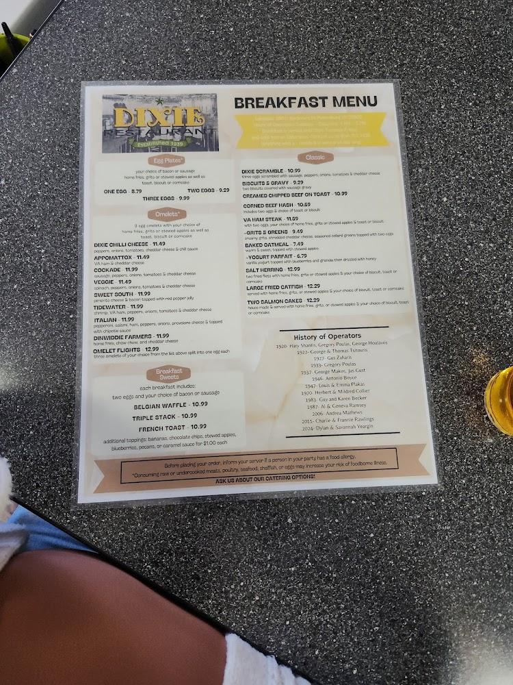 Nestled in the heart of Petersburg, VA, Dixie Restaurant is your go-to spot for a delightful southern breakfast experience. Famous for its excellent coffee and mouthwatering desserts, this family-friendly eatery offers a cozy atmosphere that welcomes all. Whether you're stopping by for a leisurely brunch or needing a quick meal on the go, our diverse menu of local specialties and comforting dishes has something for everyone. Enjoy outdoor seating or opt for takeout as you savor our signature teas. With wheelchair accessibility throughout, Dixie Restaurant is perfect for solo diners, families, and anyone seeking a taste of the South.